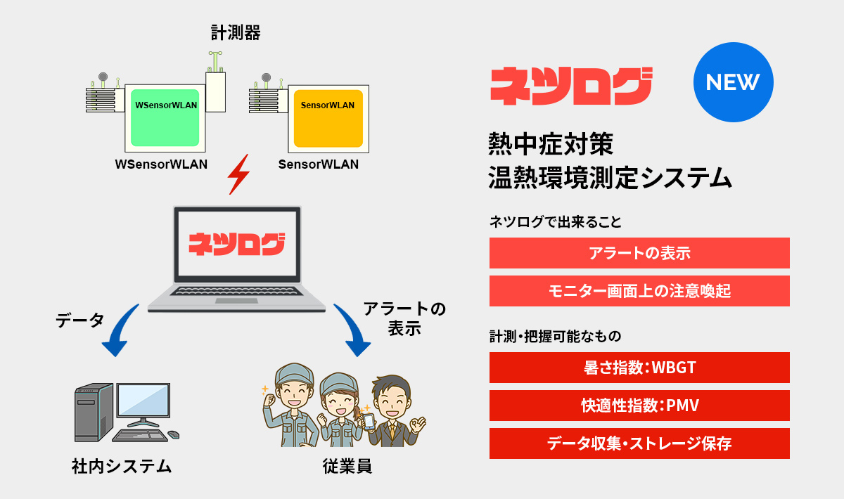 - 弊社のSUWA Monitorを用いて、熱中症危険時にはアラームを発報可能。多点・多種の情報収集と多様なグラフ表示が可能。