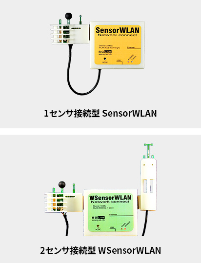LAN(Ethernet)や無線LAN(WiFi)に対応します。写真はセンサをケースに入れユニット 化したものです。SensorWLAN / WSensorWLAN 詳しくはこちら