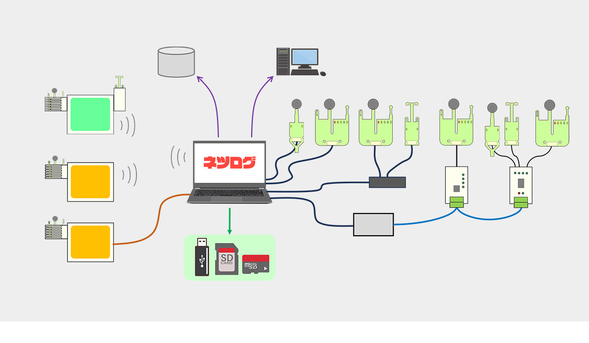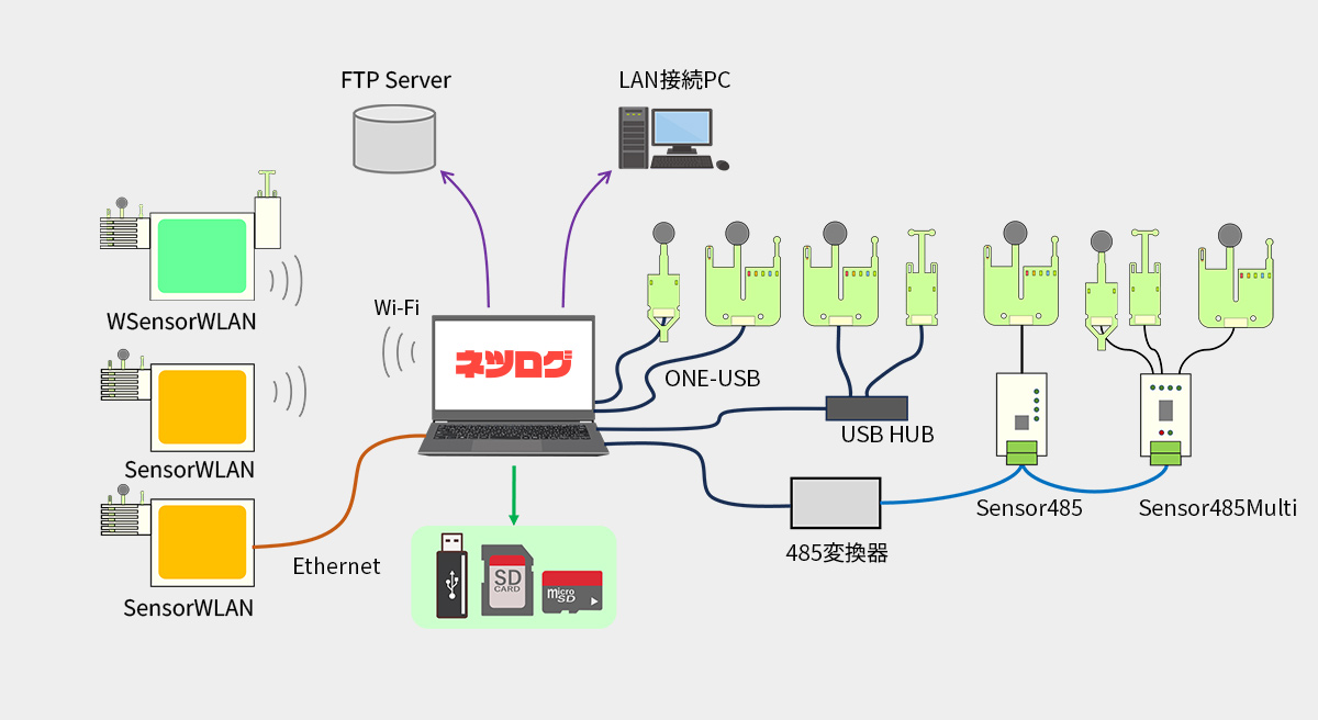 - センサとの接続は、USBケーブル接続・SensorWLAN・WSensorWLAN、RS485経由で接続します。