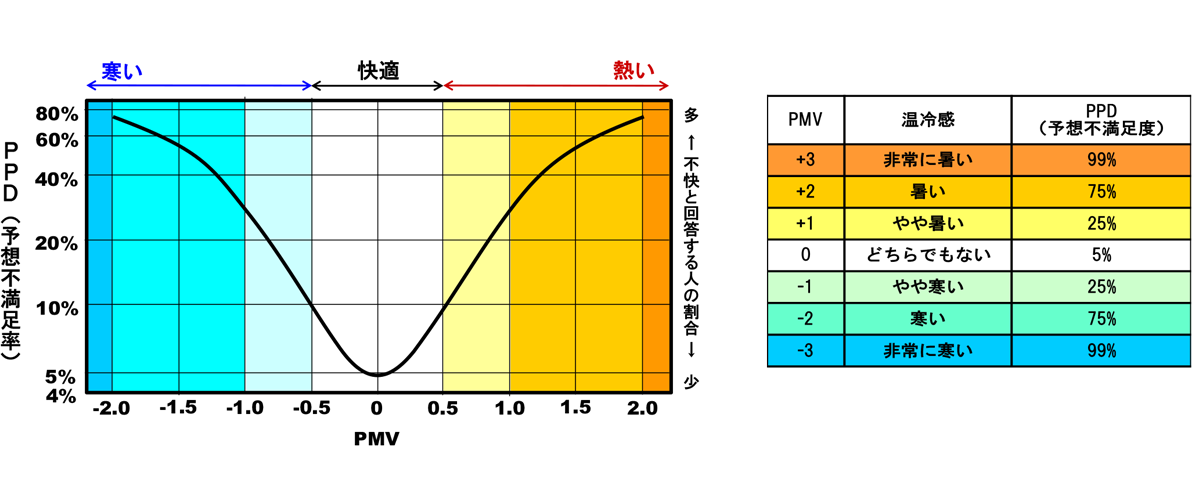 PMV(Predicted Mean Vote:予想平均温冷感申告)は、デンマーク工科大学のファンガー教授により開発された、人の温熱快適性の指標です。